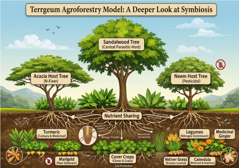 Instead of relying on monocropping, the Terrgeum model integrates primary tree species, host plants, and companion vegetation to create a resilient and productive agroforestry ecosystem